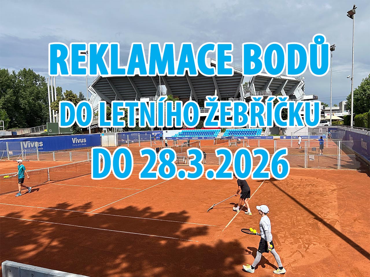 Letní žebříčky 2026: reklamace získaných bodů do 28.3.2026 Prohlédněte si v Informačním systému ČTS přehled získaných bodů a bodů započítaných do žebříčku, který bude zveřejněn 1.4.2026 a bude platit pro letní sezónu 2026. Do tohoto žebříčku se počítají body, které hráč získal v období 1.4.2025 - 31.3.2026. Do tohoto žebříčku se již NEBUDOU počítat mezinárodní turnaje, které se hrají v týdnu od 30.3.-5.4.2026 (ty už patří do letní sezóny 2026). Reklamace posílejte nejpozději do 28.3.2026 emailem na: tomas.chodora@cztenis.cz.