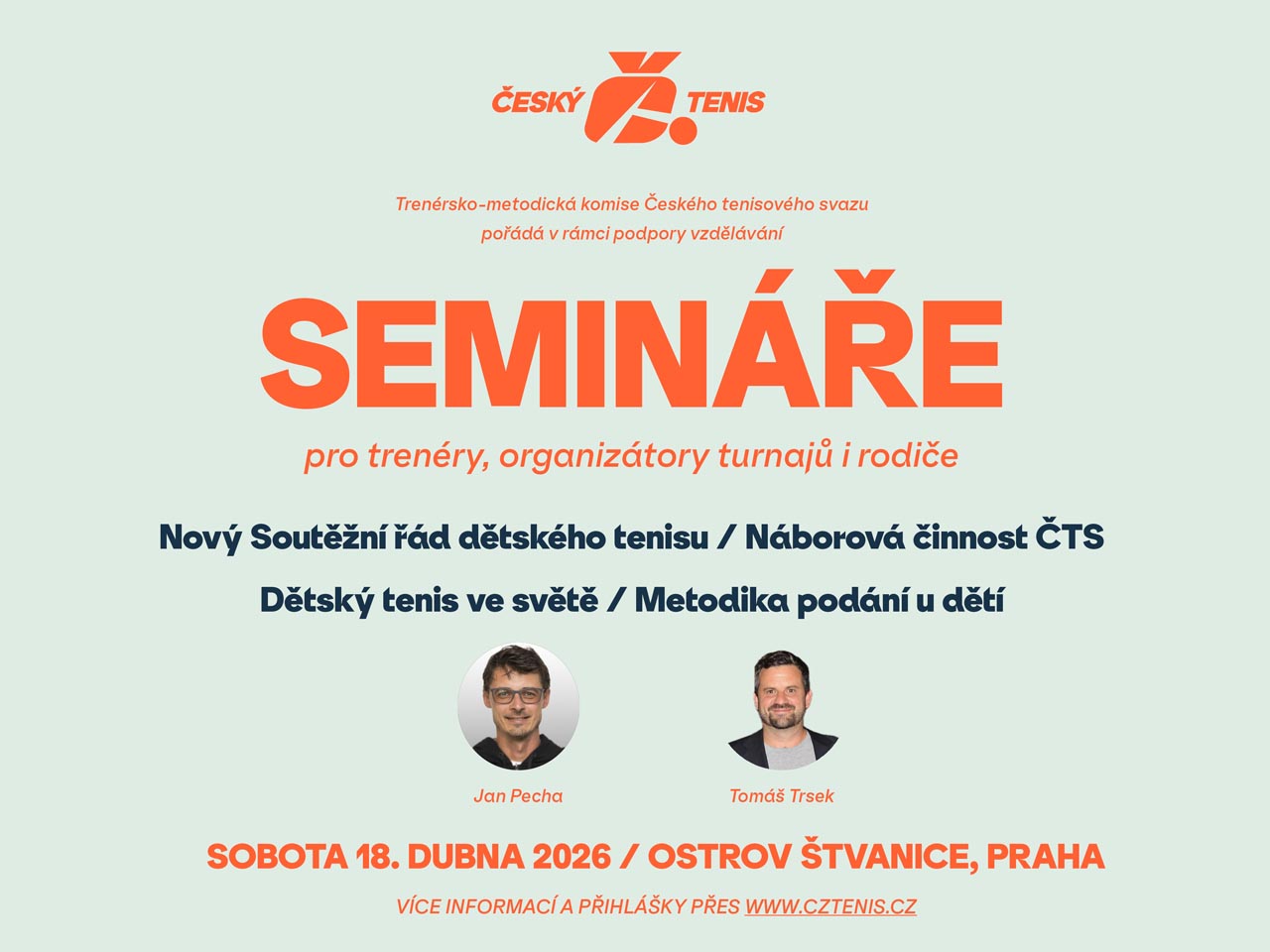 Trenérsko-metodická komise ČTS pořádá semináře: Trendy dětského tenisu V sobotu 18. dubna 2026 se v areálu I.ČLTK Praha na ostrově Štvanice uskuteční v dopoledním a odpoledním bloku semináře s názvem Trendy dětského tenisu určené pro trenéry, organizátory turnajů i rodiče. Na každý seminář je nutné se registrovat zvlášť v sekci Školení trenérů a rozhodčích na webu ČTS!