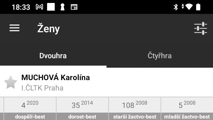 Aplikace ČTS: Nejlepší žebříčkové umístění v jednotlivých věkových kategoriích10.07.2023 V aktivitě hráče pod jménem a klubovou příslušností najdeje šedý proužek, ve kterém jsou zobrazeny ročník narození, pozice na aktuálním žebříčku a počet výher/proher (počítaný pouze s českých turnajů a mistráků). Tento proužek však jde posunout směrem doleva a najdete zde další zajímavé informace jako jsou nejlepší žebříčková umístění v jednotlivých věkových kategoriích. Na obrázku vidíte, že Karolína Muchová si v kategorii staršího žactva dala pauzu vynucenou zraněními a přesto je dnes v absolutní světové špičce.