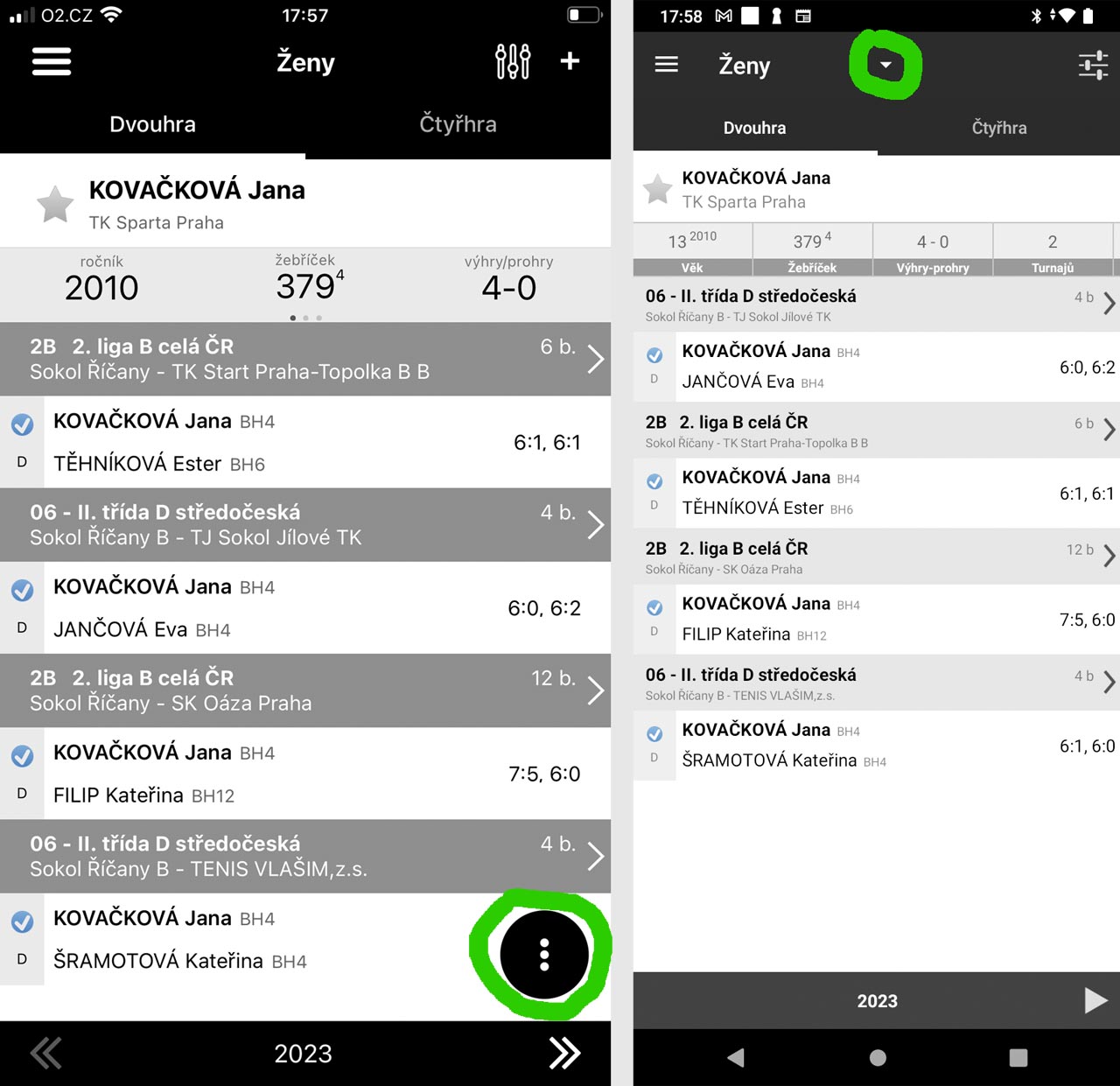 Aplikace ČTS: Přepínání mezi věkovými kategoriemi v aktivitě hráče Aktivita (profil) hráče zobrazuje odehrané zápasy v dané sezóně (přepínač sezón dole) v dané věkové kategorii. Pokud si chcete zobrazit odehrané zápasy v jiné věkové kategorii, použijte přepínač, který najdete na iphonu vpravo dole (černé kolečko se 3 tečkami). Na telefonech android je přepínač úplně nahoře u názvu věkové kategorie a vypadá jako zobáček. Přepínání mezi výsledky dvouhry a čtyřhry najdete nad jménem hráče a je řešen formou záložek.