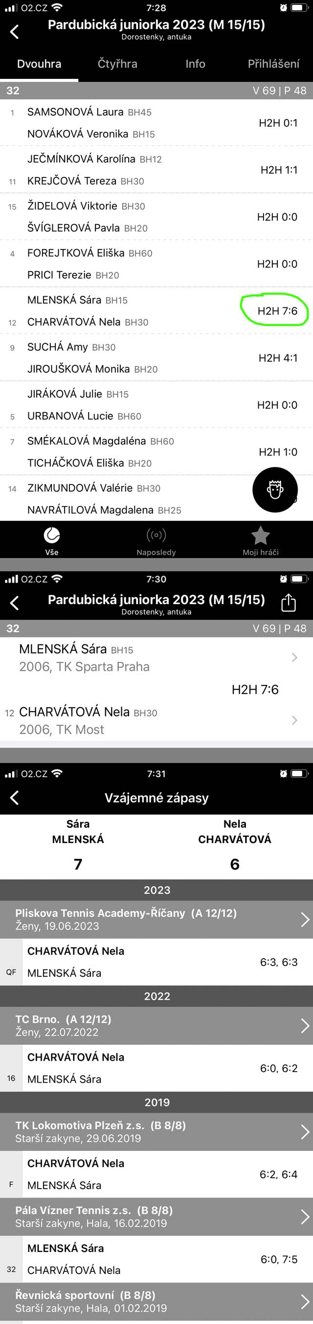 Aplikace ČTS: Vzájemné bilance hráčů30.07.2023 Vzájemná bilance hráčů mnohdy napoví, kdo je favoritem duelu. Aplikace ČTS kromě vzájemné bilance (v aplikaci označované H2H = head to head) nabízí i výpis těchto vzájemných zápasů (po kliknutí na údaj H2H). Na obrázku níže vidíte, že dorostenky Mlenská a Charvátová spolu sehrály již 13 zápasů na turnajích jednotlivců a družstev ČTS. Sára Mlenská sice vede 7:6, ale poslední vzájemný zápas z června 2023 vyhrála Nela Charvátová. Dívky spolu sehrají v neděli 30. července svůj čtrnáctý vzájemný zápas.