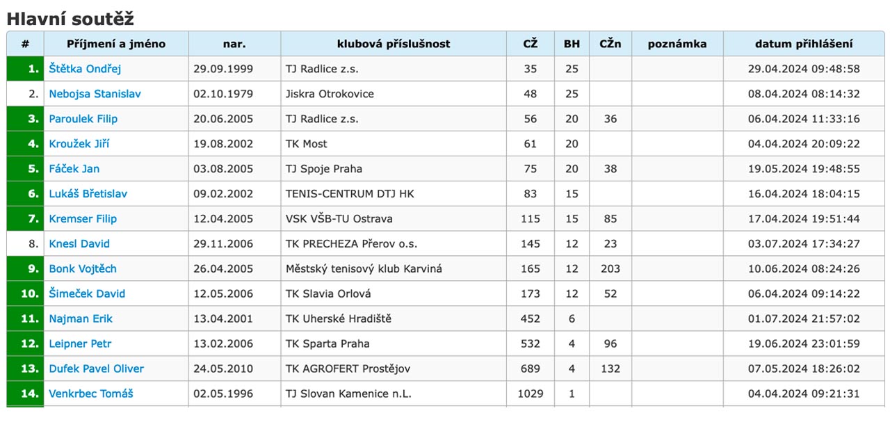 Mistrovství ČR jednotlivců v kategorii mužů a žen 2024. Přihlášky do 2.8.2024 v Informačním systému ČTS nebo u ředitele turnaje Tomáše Ostraka e-mail: tomas.ostarek@seznam.cz, mobil: 602 778 038. Seznamy účastníků: muži, ženy.