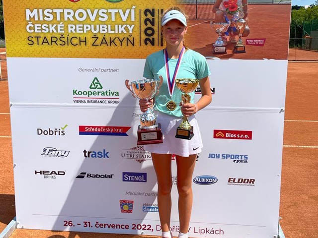 Alena Kovačková vyhrála Mistrovství Evropy do 14 let v Mostě Alena Kovačková (2008, TE U14 1) vyhrála Mistrovství Evropy v kategorii dívek do 14 let, které se hrálo v Mostě. Ve finále porazila Slovenku Pohankovou 5:7, 6:4, 6:4. Čtyřhru vyhrály Eliška Forejtková s Alenou Kovačkovou, které v českém finále porazily Lauru Samsonovou a Veroniku Sekerkovou 4:6, 6:1, 10:3. Na Mistrovství Evropy do 16 let v Přerově došli do semifinále Lucie Urbanová a Jan Kumstát. V kategorii do 18 let v Klosters do semifinále došli Brenda Fruhvirtová a Jakub Menšík. Menšík spolu s Jakubem Nicodem vyhráli čtyřhru.