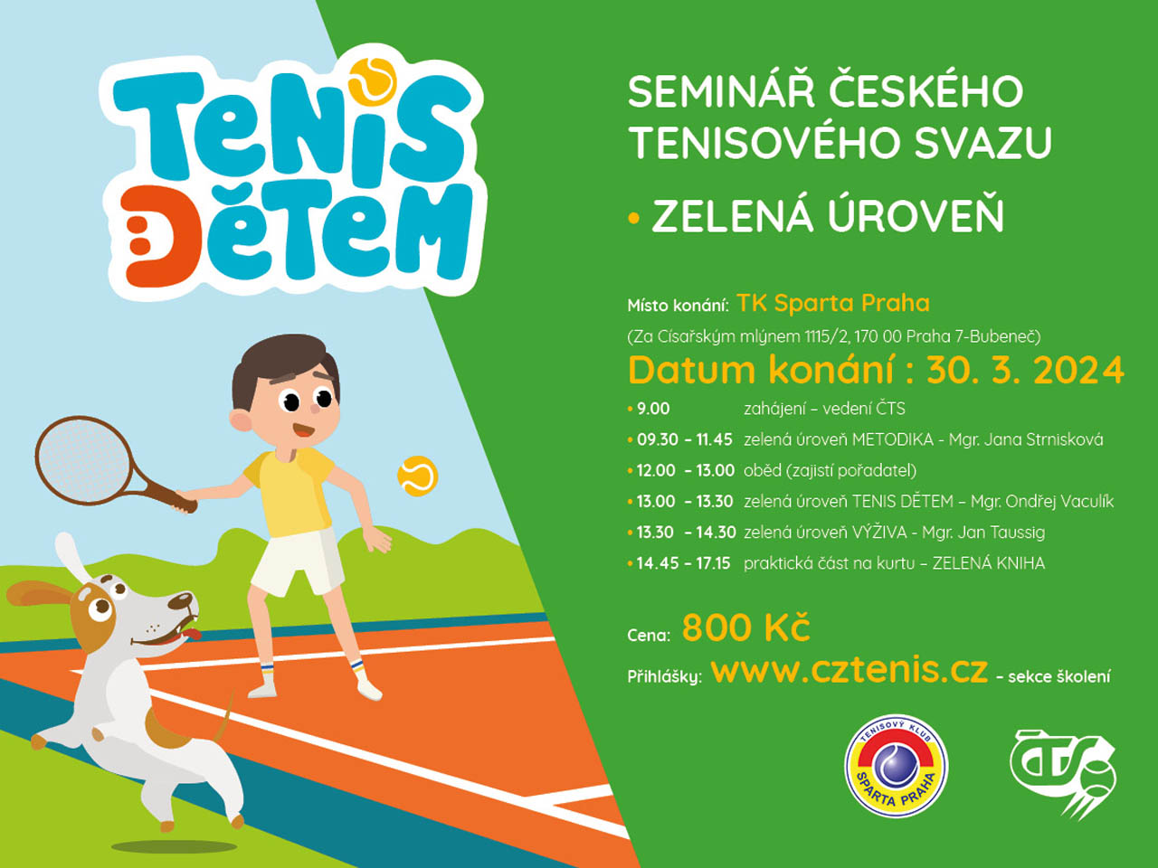 Seminář ČTS - tenis dětem Třetí pokračování semináře ČTS – zelená úroveň. Ucelená tenisová metodika rozvíjející děti dětí do 9 let. V areálu Pliskova Tennis Academy (V Chobotě 2112, Říčany) se 30.3.2024 bude konat seminář na téma tenis v zelené úrovni. Přihlášky v sekci ŠKOLENÍ.